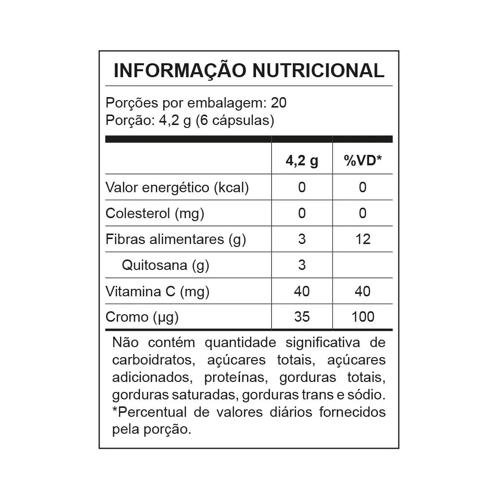 Suplemento à base de quitosana e psyllium adicionado de vitamina C e picolinato de cromo.