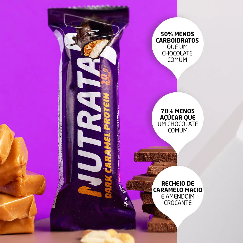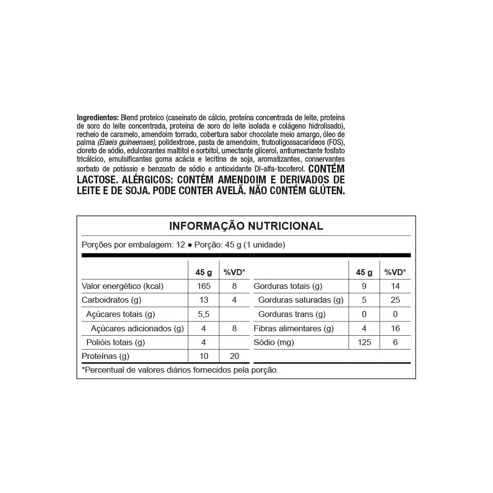 10 g de proteínas; Deliciosa cobertura de chocolate; Recheio de caramelo macio e amendoim crocante; Blend de proteínas de alto valor biológico; Com whey protein; 50% menos carboidratos que um chocolate comum; 78% menos açúcar que um chocolate comum; 0 gordura trans; Sem adoçantes artificiais.