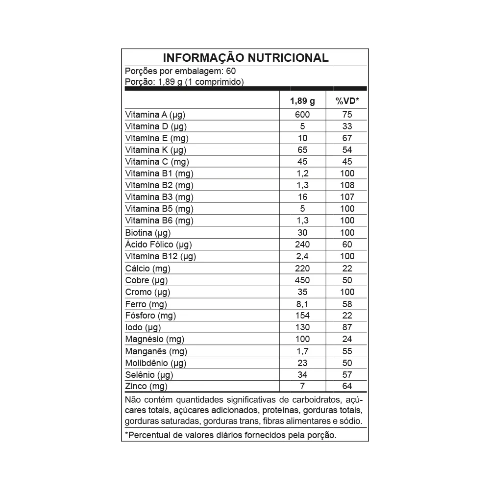 13 vitaminas e 11 minerais; Ideal para quem quer complementar a alimentação diária; Sua fórmula balanceada foi desenvolvida dentro dos valores recomendados para as necessidades diárias; Alta biodisponibilidade; 100% da IDR das principais vitaminas; Sem valor calórico.