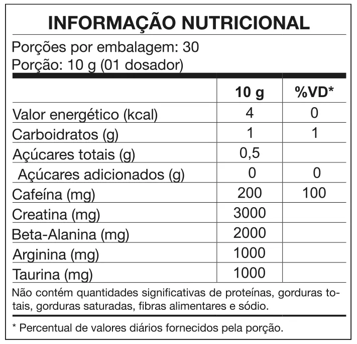 Formulação a base de creatina, beta alanina, arginina, taurina e cafeína; Complementa os estoques endógenos de creatina; A creatina auxilia no aumento do desempenho físico durante exercícios repetidos de curta duração e alta intensidade; A cafeína auxilia no aumento do estado de alerta e na melhora da concentração.