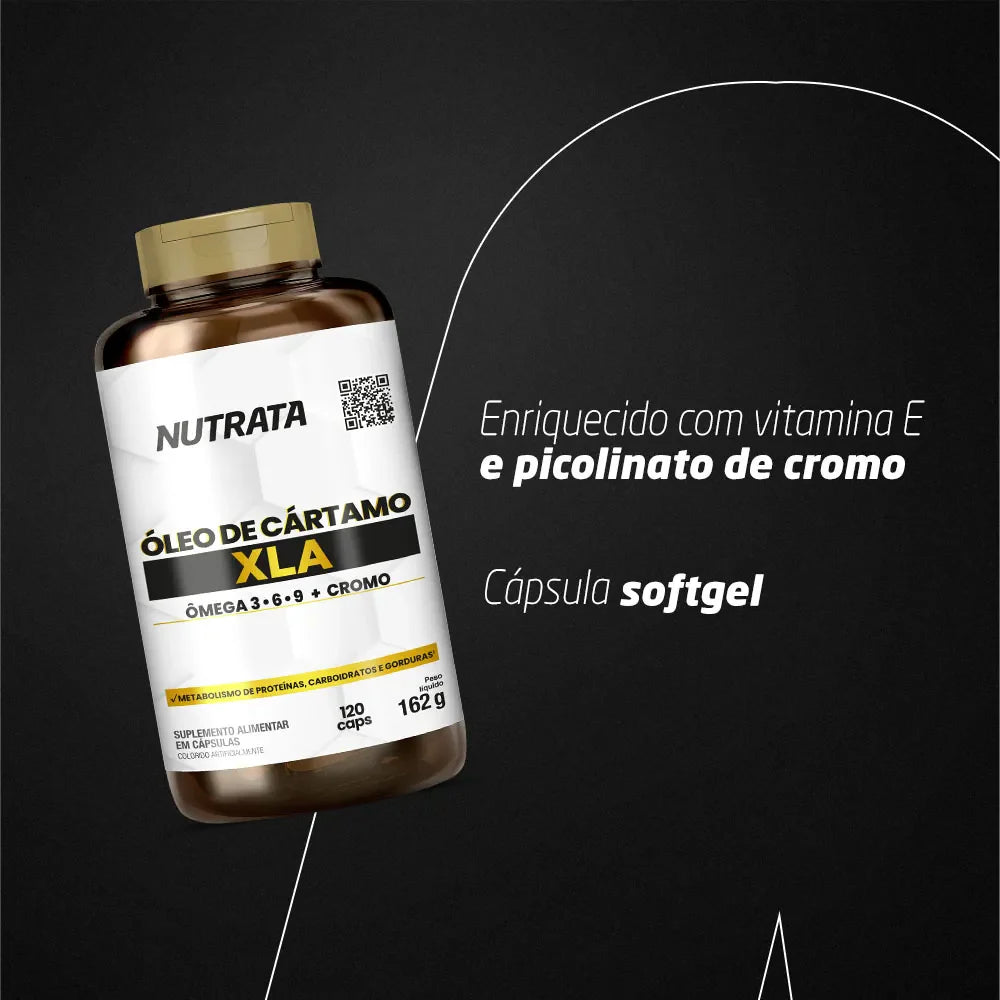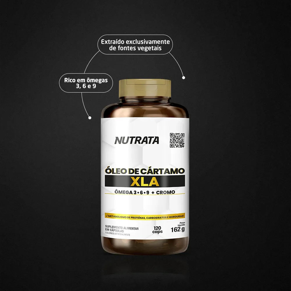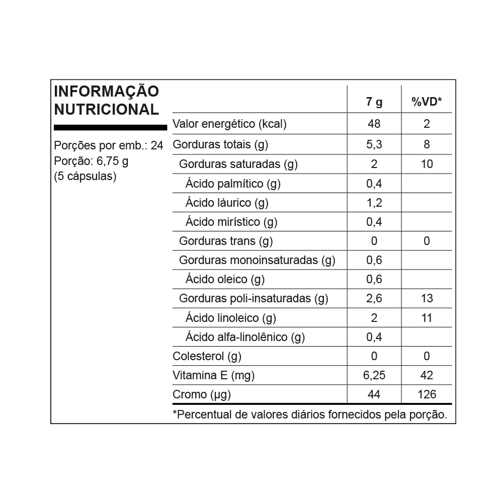 Suplemento à base de óleos vegetais: cártamo (Carthamus tinctorius), coco (Cocus nucifera) e chia (Salvia hispânica), enriquecido com vitamina E e picolinato de cromo.